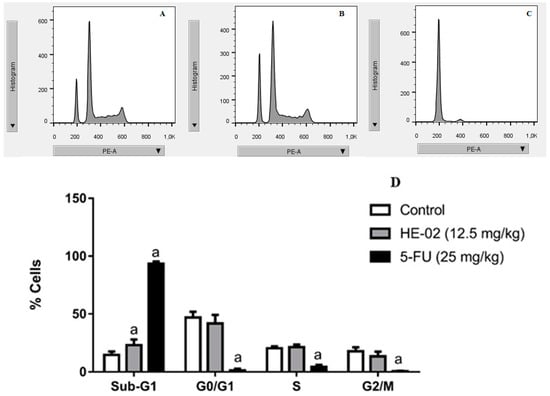 Effects of HE-02 and 5-FU on the cell cycle of Ehrlich ascites carcinoma cells. Representative histograms of ascites carcinoma cells in different phases of the cell cycle after treatment with: (A) 12% tween 80 (tumor control); (B) HE-02 (12.5 mg/kg); (C) 5-FU (25 mg/kg); (D) Percentage of Ehrlich ascites carcinoma cells in phases of cell cycle after different treatments. Data presented as mean ± SEM of six animals analyzed by ANOVA followed by Tukey test. a p < 0.05 compared to the tumor control group.