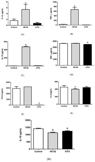Effect of HE-02 (12.5 mg/kg) and 5-FU (25 mg/kg) on the levels of IL-1β (A), TNF-α (B), IL-12 (C), INF-γ (D), CCL2 (E), IL-4 (F) and IL-10 (G) in the peritoneal lavage of Ehrlich ascites carcinoma transplanted mice. Data presented as mean ± SEM of six animals analyzed by ANOVA followed by Tukey test. a p < 0.05 compared to tumor control group.