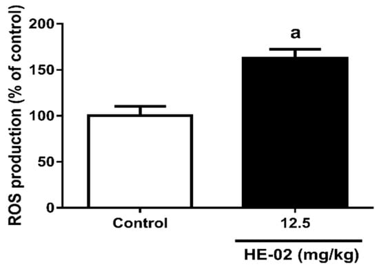Reactive Oxygen Species (ROS) production (% of control) after treatment with HE-02 (12.5 mg/kg). Data presented as mean ± SEM of six animals analyzed in pairs by Mann–Whitney Test. a p < 0.05 compared to the control group.