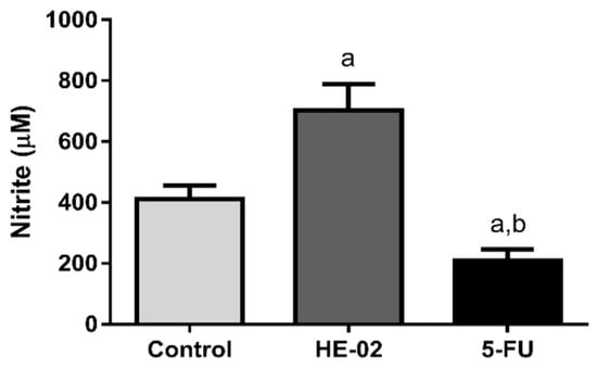 For the group treated with 12.5 mg/kg HE-02, a significant increase in nitrite concentration (703 ± 85.44 μM) was observed in comparison to the control group (410.4 ± 38.66 μM). The 5-FU (25 mg/kg) induced a significant decrease in nitrite concentration (209.1 ± 37.05 μM) (Figure 6).
