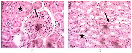 Histopathology of the kidneys of different groups: (A) Control, cortical region, renal glomerulus (arrow) and cortical labyrinth (star). (B) Control, medullary region, collecting tubules (star), loop of Henle and vessels straight (arrow). (C) Group 5-FU, cortical region, glomerulus (arrow) and cortical labyrinth (star). (D) Group HE-02 (12.5 mg/kg), subcapsular region, cell infiltrate (arrow). (E) Group HE-02 (12.5 mg/kg), cortical region, renal corpuscle (arrow) and cortical labyrinth (star). (F) Group HE-02 (12.5 mg/kg), medullary region, loop of Henle and medullar rays (arrow), collecting tubules (star). A, B, C, D, E and F-HE, A.T. ×400.