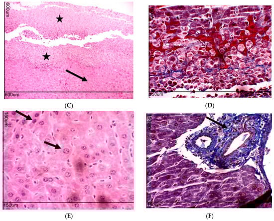 Histopathology of liver of experimental groups. Control group: (A) hepatic triad, cellular infiltrate around the hepatic duct; 5-FU: (B) cell infiltrate around the branch of the portal vein (arrow); HE-02 (12.5 mg/kg): (C) cellular infiltrate in the subcapsular region (star) and hepatocyte plaque (arrow); (D) subcapsular cell infiltrate characterized by the presence of macrophages and hepatocytes in apoptosis; (E) hepatocytes with varied affinity to both nuclear and cytoplasmic dyes and change in nuclear size (arrow); (F) cellular infiltrate in the portal space (arrow). A, B, D, E and F-HE, A.T. ×400. C-HE, A.T. ×100.