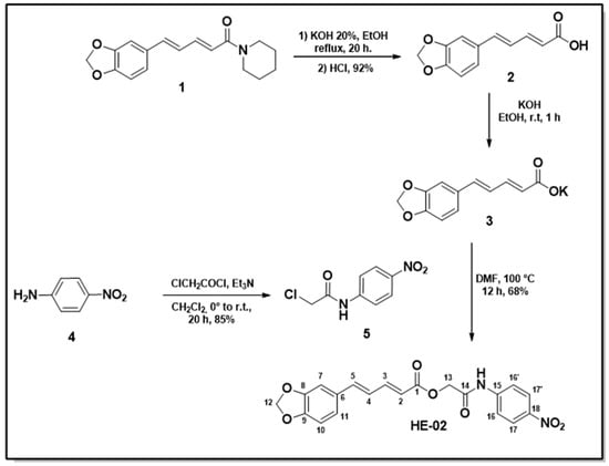 Synthesis of the compound N-(p-nitrophenyl)acetamide piperinoate (HE-02). Piperine 1 was obtained by the ethanolic extraction of the ground black pepper (P. nigrum) seed in yield ranging from 3–7% []. Piperinic acid 2 was obtained from piperine 1 in 92% yield by basic hydrolysis []. A neutralization reaction was carried out with piperinic acid 2 in an ethanolic solution of potassium hydroxide, thereby obtaining the potassium piperinoate 3 in high yield. The 2-chloro-N-(4-nitrophenyl)acetamide 5 compound was obtained in N-acetylation reaction between 4-nitroaniline 4 and 2-chloroacetyl chloride []. Reaction between the potassium salt of piperinic acid 3 with 2-chloro-N-(4-nitrophenyl)acetamide 5 in N,N-Dimethylformamide (DMF) provided the formation of N-(p-nitrophenyl)acetamide piperinoate HE-02 in yield of 60%.