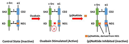 One question regarding the abovementioned “Na/K-ATPase signaling-mediated oxidant amplification loop” is, could this amplification loop be controlled and targeted for possible therapeutic implication(s)? In the Na/K-ATPase/c-Src signaling complex model, it was demonstrated that the α1 ND1 domain binds to the c-Src tyrosine kinase domain and the α1 CD2 domain binds to the c-Src SH2 domain in the “resting” state [55]. Upon ouabain stimulation, c-Src is activated (phosphorylation of Tyr418) due to the disruption of the binding between the α1 ND1 domain and the c-Src tyrosine kinase domain. Based on this working model, mapping of these domains led to the identification of a peptide named NaKtide (derived from the Ser415-Gln434 of the pig α1 ND1 domain). In order to further explore this relationship, a cell-permeable version of NaKtide, named pNaKtide, was created. A 13-amino-acid TAT leader sequence makes pNaKtide positive and therefore cell permeable. pNaKtide targets the α1/Src receptor complex close to the plasma membrane inside the cell [41,56]. Both NaKtide and pNaKtide act as specific antagonists of c-Src phosphorylation (Figure 1), further demonstrating that the binding of the α1 and c-Src and the conformational change are critical in the activation of Na/K-ATPase signaling.