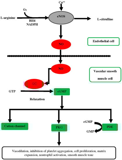 This enzymatic conversion of arginine to NO by eNOS requires oxygen and the reduced cofactors, tetrahydrobiopterin (BH4) and nicotinamide adenine dinucleotide phosphate (NADPH) []. Increased intracellular calcium in response to vasodilator agonists such as acetylcholine and bradykinin leads to activation of eNOS and increased production of NO in endothelial cells. NO diffuses into vascular smooth muscle cells where it activates soluble guanylyl cyclase (sGC), in turn forming cyclic guanosine monophosphate (cGMP) to elicit vasorelaxation, as shown in Figure 1. This NO/sGC/cGMP pathway has shown a spatial distribution in the kidney, and its importance in this organ is supported by many studies [,]. The level of cGMP is determined by the balance between the synthesizing enzyme soluble guanylyl cyclase (sGC) and catabolizing enzyme (PDE), which metabolizes cGMP to its biologically inactive metabolite, 5′-GMP, as shown in Figure 1. In most cells, the rate of synthesis of cGMP is 10-fold lower than its rate of hydrolysis by phosphodiestrase (PDE) []. Therefore, inhibition of PDE is considered a therapeutic target in many pathological conditions such as erectile dysfunction [], in which an elevated levels of NO is desired. Another interaction of cGMP is with protein kinase G (PKG), which is activated upon CGMP stimulation to phosphorylate different target proteins upon cGMP stimulation. These proteins are involved in vasodilation, neutrophil activation, smooth muscle tone modulator, and matrix expansion [] as shown in Figure 1.