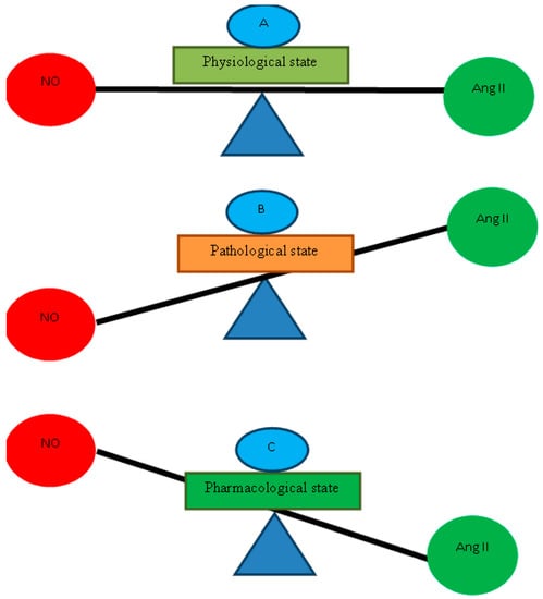 Different levels of NO and Ang II depicting different states of the body. (A) shows normal levels of NO and Ang II in normal physiological conditions. (B) represents that levels of Ang II increased while that of NO is reduced in plasma and tissue in pathological states like hypertension and LVH, while (C) indicates that pharmacological treatment with NO donors or Ang II inhibitors increases the NO and reduced the levels of Ang II to offset the pathological state.