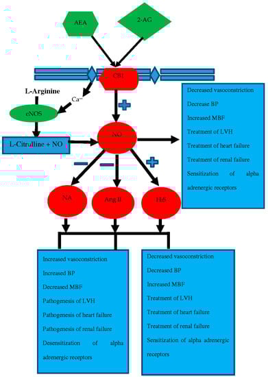 ECs and the prototype cannabinoid and well known drug of abuse, tetrahydrocannabinol (THC), share the ability to elicit a drop in blood pressure and heart rate []. Interestingly, hypotension induced by AEA was absent in normotensive rats [,] but present in spontaneously hypertensive rats [], suggesting a sympathoinhibitory action of AEA. This effect may be explained by inhibition of peripheral NA release mediated by AEA-induced NO release [,], thereby offsetting the pharmacological responses of NA (Figure 4). AEA can exert an autoregulatory function in vascular endothelial cells by stimulating eNOS and subsequent NO generation via the CB1 receptor []. The link between AEA and NO formation has been described in other systems []. The previously discussed interaction of NO and NA together with evidence that AEA elicits sympatho-inhibition activity by inhibiting NA release [,] clearly supports the triangular connection between AEA/NO/NA pathways shown in Figure 4. This linkage whereby ECs offset the responses of NA by releasing NO is supported by studies in rats [] and anesthetized dogs []. CB1 receptors mediate their responses by releasing NO, and it can be speculated that CB1 agonists increase NO activity. Though the EC system has not been studied as extensively in the kidney as compared to the brain, our laboratory showed exogenous intramedullary administration of AEA produced diuretic and natriuretic effects without impacting medullary blood flow or blood pressure []. It may be hypothesized that AEA or other EC ligands for the CB1 receptor mediate their actions in kidney via an NO-dependent mechanism.