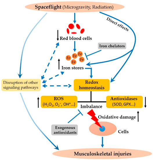 Hypothetical model on how spaceflight leads to injuries in the musculoskeletal system. Exposure of tissues to the spaceflight environment, such as microgravity and radiation, leads to a decreased mass of red blood cells. This induces elevated iron stores, due to iron release from destroyed erythrocytes. Excess iron leads to an imbalance in redox homeostasis, owing to increased levels of reactive oxygen species (ROS) and reduced levels of antioxidases. The spaceflight environment may also have direct effects on iron metabolism and redox homeostasis. The imbalance of redox status leads to the oxidative damage of cells, which in turn result in injuries in the musculoskeletal system. Other signaling processes are disrupted by the spaceflight environment, and may also cause these defects. Some exogenous iron chelators and antioxidants may block the increases in iron and the imbalance in redox status, thereby preventing oxidative damage.