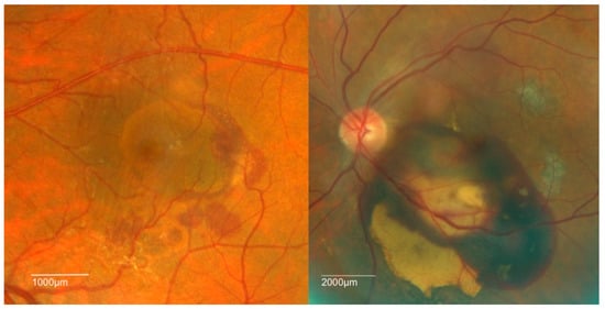 - Klais, C.M.; Ober, M.D.; Freund, K.B.; Ginsburg, L.H.; Luckie, A.; Mauget-Faysse, M.; Coscas, G.; Gross, N.E.; Yannuzzi, L.A. Choroidal infarction following photodynamic therapy with verteporfin. Arch. Ophthalmol. 2005, 123, 1149–1153. [Google Scholar] [CrossRef] [PubMed]