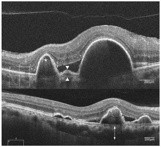 - Alshahrani, S.T.; Al Shamsi, H.N.; Kahtani, E.S.; Ghazi, N.G. Spectral-domain optical coherence tomography findings in polypoidal choroidal vasculopathy suggest a type 1 neovascular growth pattern. Clin. Ophthalmol. 2014, 8, 1689–1695. [Google Scholar] [CrossRef] [PubMed]
