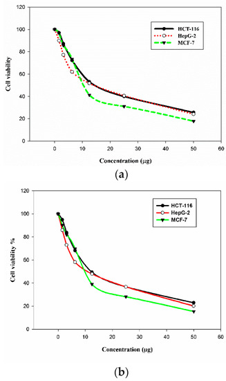 | Sample Conc. (μg/mL) | HCT-116 Viability % | HepG-2 Viability % | MCF-7 Viability % | |||