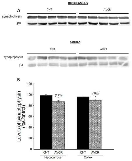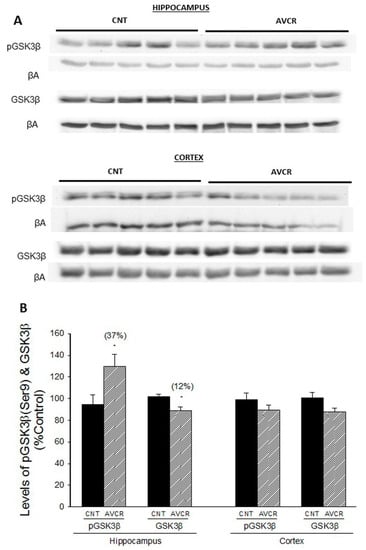 2.1. Effects of AVCRI104P3 on Akt1, Bcl2, GSK3β, Caspases, p25/p35 and Synaptophysin Expression