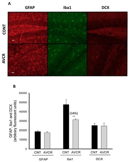 2.2. Effects of AVCRI104P3 on Neuroinflammation (GFAP, Iba-1) and Neurogenesis (DCX) in the Brain