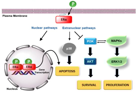 - Lee, Y.R.; Park, J.; Yu, H.N.; Kim, J.S.; Youn, H.J.; Jung, S.H. Up-regulation of pi3k/akt signaling by 17beta-estradiol through activation of estrogen receptor-alpha, but not estrogen receptor-beta, and stimulates cell growth in breast cancer cells. Biochem. Biophys. Res. Commun. 2005, 336, 1221–1226. [Google Scholar] [CrossRef] [PubMed]