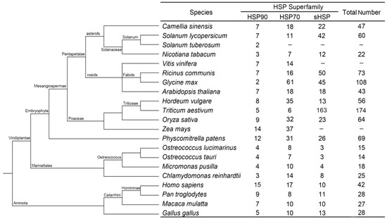 Twenty other species in which HSP superfamily genes have been identified were comparatively analyzed to further evaluate the family composition of the CsHSPs, and the results showed that the distribution of the CsHSP members maintained a similar proportion to those of other higher plants, namely, the HSP90 family had significantly fewer members than the HSP70 and sHSP families did. However, the above trend is not evident in lower plants, which have very few sHSP members. In addition, the total number of HSPs in lower plants is significantly less than that in higher plants. In animals, almost equal numbers of genes were found in the three HSP families, showing a distribution clearly different from those of higher plants (Figure 1).