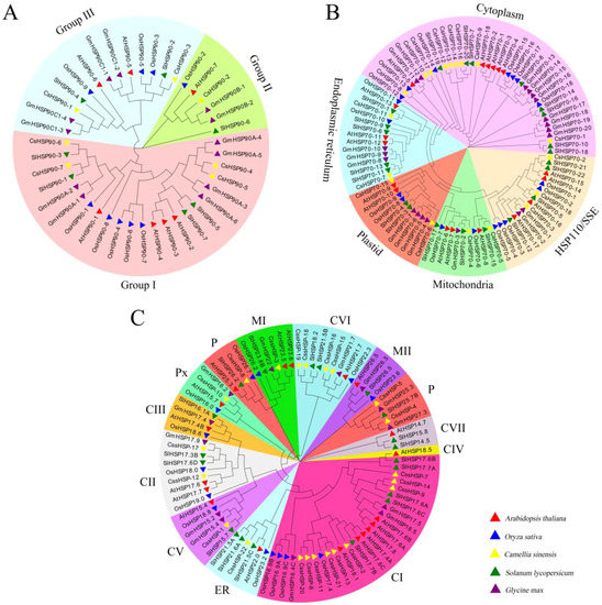 Phylogenetic tree of CsHSP90 (A), CsHSP70 (B), and CssHSP (C). Phylogenetic tree of HSP proteins in tea plant and other plant species were generated by MEGA 7 using neighbor-joining. Cs: Camellia sinensis, At: Arabidopsis thaliana, Os: Oryza sativa, Gm: Glycine max, and Sl: Solanum lycopersicum; CI–CVII: cytoplasm I–VII, ER: endoplasmic reticulum, MI–MII: mitochondria I–II, P: plastid, and Px: peroxide. The protein ID of all species is listed in Table S2.