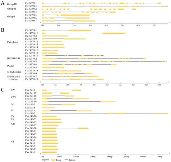 Exon–intron structure analyses of CsHSP90 (A), CsHSP70 (B), and CssHSP (C) genes. The yellow sections represent exons, and the grey parts indicate introns. CI, CII, CV, and CVI: cytoplasm I, II, V and VI; ER: endoplasmic reticulum, MI: mitochondria I; P: plastid; and Px: peroxide.