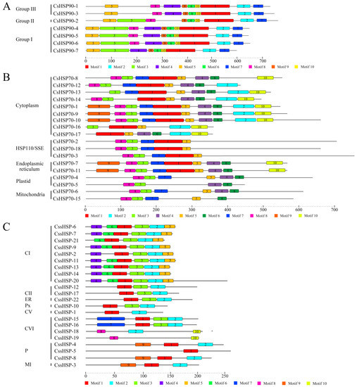 Distribution of conserved motifs in CsHSP90 (A), CsHSP70 (B), and CssHSP (C). Putative motifs are represented by a number in a colored box. CI, CII, CV, and CVI: cytoplasm I, II, V and VI; ER: endoplasmic reticulum, MI: mitochondria I; P: plastid, and Px: peroxide.