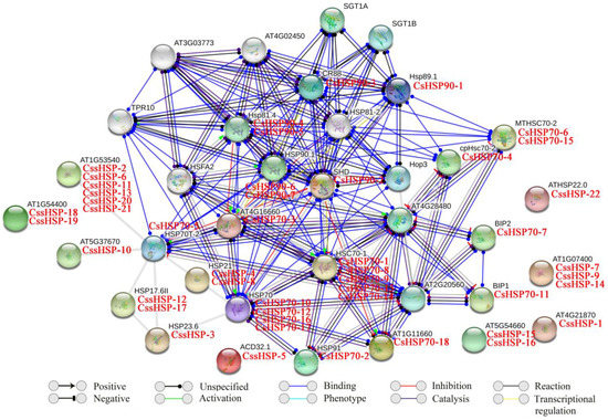 In this study, the functional and physical protein interactions of the CsHSPs were validated by constructing an Arabidopsis association model using STRING software (version 10.5, https://string-db.org/). The results showed that 47 CsHSPs associated with 26 known Arabidopsis HSPs participated in the interaction network (Table S4 and Figure 5). As expected, the network showed general and complex interactions between HSP70 and HSP90 family proteins; for example, HSP70 (corresponding to CsHSP70-10, -12, -16, and -17), HSP70T-2 (corresponding to CsHSP70-5), HSC70-1 (corresponding to CsHSP70-1, -8, -9, -13, and -14) and MTHSC70-2 (corresponding to CsHSP70-6 and -15) closely interact with HSP81.4 (corresponding to CsHSP90-4 and -5), SHD (corresponding to CsHSP90-2), and HSP90.1 (corresponding to CsHSP90-6 and -7). Simultaneously, HOP3, an HSP70/HSP90 organizing protein, was closely connected to many HSP70 and HSP90 family proteins, implying that it plays important roles in their functions. In addition, 3 HSP110/SSE subfamily proteins (corresponding to CsHSP70-2, -3, and -18) showed very positive interactions with other HSP70 family proteins, especially the members of the cytoplasm subfamily. Furthermore, an extensive interaction was observed between the transcription factor HSFA2 and the HSP70 and HSP90 proteins. By contrast, some sHSPs (corresponding to CssHSP-2, -3, -6, 10, -11, -12, -13, -17, -20, and -21) were associated with only HSP70T-2 proteins, and others were independent.