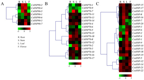 Expression patterns of CsHSP90 (A), CsHSP70 (B), and CssHSP (C) genes in different tissues of tea plant. R indicates root; S, stem; L, leaf; F, flower. The heatmap was generated by MeV software (TIGR, Rockville, MD, USA) using the CsHSP genes’ expression data, and normalized log2 transformed values were used with hierarchical clustering. The red and green colors indicate higher or lower transcript abundances than those of the relevant control, respectively.