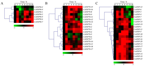 Expression profiles of CsHSP90 (A), CsHSP70 (B), and CssHSP (C) genes in tea plant under heat stress (40 °C). The heatmap was generated by MeV software using the CsHSP genes expression data, and normalized log2 transformed values were used with hierarchical clustering. The red and green colors indicate higher or lower transcript abundances than those of the relevant control, respectively.