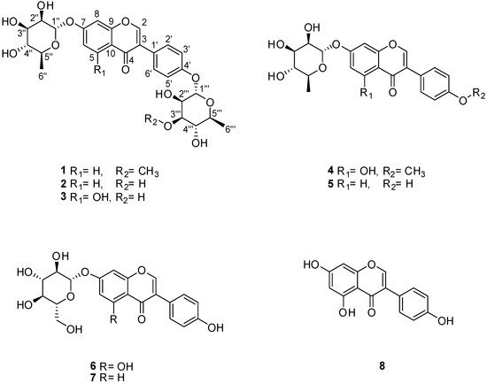 - Tan, Y.; An, N.; Li, Y.; Cheng, S.; Zhang, J.; Zhang, X.; Li, Y. Two new isoflavonoid glucosides from the roots of Achyranthesbidentata and their activities against nitric oxide production. Phytochem. Lett. 2016, 17, 187–189. [Google Scholar] [CrossRef]