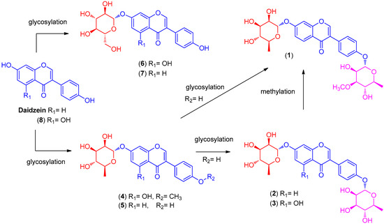 - Al-Maharik, N.; Botting, N.P. An efficient method for the glycosylation of isoflavones. Eur. J. Org. Chem. 2008, 33, 5622–5629. [Google Scholar] [CrossRef]