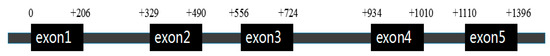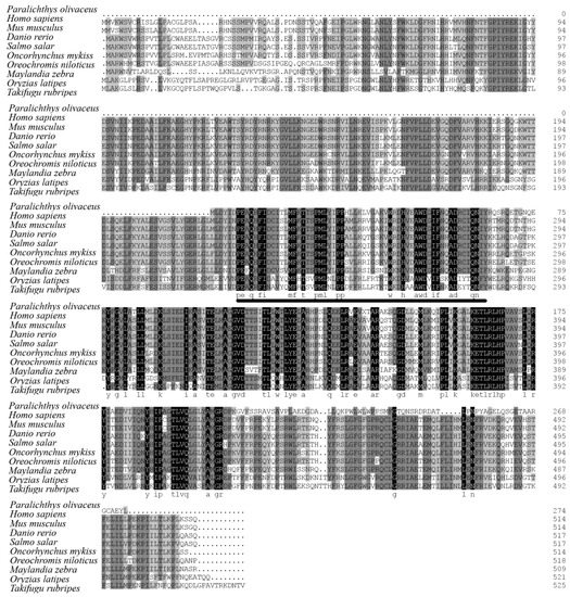 The genomic sequence of the flounder cyp11a we obtained was 1396 bp, which contains 5 exons and 4 introns, and its cDNA sequence was 828 bp (Figure 1). The cloned flounder Cyp11a amino acids share 76.7% with T. rubripes, 77.1% with Ory. latipes, 69.4% with D. rerio, 75.9% with M. zebra, 75.6% with Ore. niloticus, 75.0% with S. salar, and 75.0% with On. mykiss.