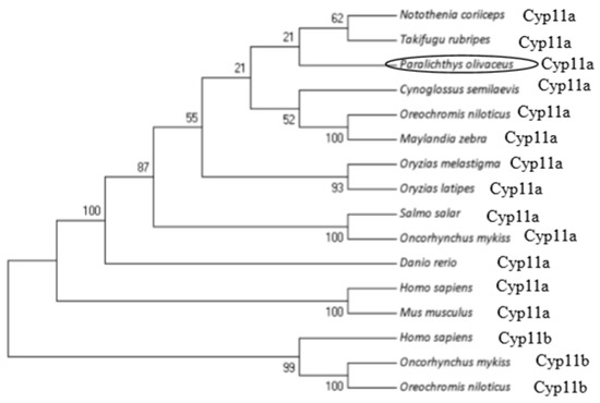 Phylogenetic tree of vertebrate Cyp11a and Cyp11b proteins. Values at the branch points indicate the percentage of 1000 bootstrap replicates supporting the division. The circled words is scientific name of the flounder.