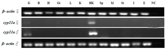 According to the semi-quantitative reverse transcription polymerase chain reaction (RT-PCR) results in adult tissues, flounder cyp11a was expressed in gonads, and the expression level was higher in the testis than in the ovary (Figure 4). The gene was also strongly expressed in the head kidney (HK) of both sexes.