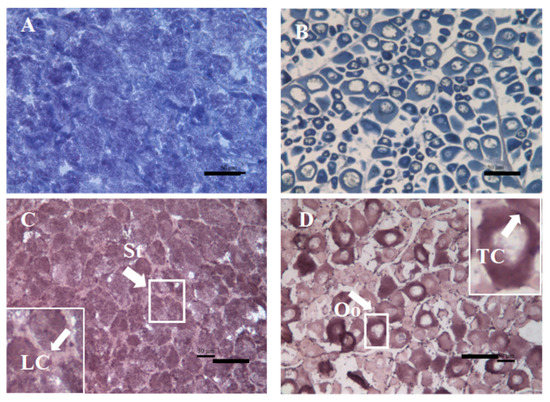 - Kobayashi, T.; Nakamura, M.; Kajiura-Kobayashi, H.; Young, G.; Nagahama, Y. Immunolocalization of steroidogenic enzymes (P450scc, P450c17, P450arom, and 3β-HSD) in immature and mature testes of rainbow trout (Oncorhynchus mykiss). Cell Tissue Res. 1998, 292, 573–577. [Google Scholar] [CrossRef] [PubMed]