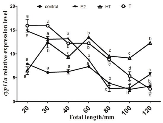Histological observation revealed that the sex ratios (percentages of female) in the control, estradiol (E2), high temperature (HT) and testosterone (T) treated groups were 75%, 100%, 0% and 0%, respectively (n = 20), when the juveniles reached 150 mm total length (TL) [24]. According to our previous study [25], the flounder ovary differentiation started when ovarian cavity was firstly observed at 38.0 ± 1.7 mm TL, and oocytes were subsequently detected at 86.5 ± 5.9 mm TL. Testis differentiation was initially observed at 63.5 ± 3.4 mm TL. The seminal lobule appeared at approximately 76.0 mm TL. Expression levels of cyp11a during the gonad differentiation period shown by quantitative PCR (qPCR) were more elevated until the juveniles reach 60 mm TL and significantly dropped afterwards in the control group without treatment (p < 0.05) (Figure 7). The expression level of cyp11a in the E2 group was significantly more elevated at 20, 30 and 40 mm TL, then significantly decreased at 60, 80, 100 and 120 mm TL (p < 0.05), while in the T group its expression levels remained relatively higher before and at 60 mm TL, and then dropped at 80, 100 and 120 mm TL. In the HT group, cyp11a expression levels showed similar patterns to those in the T group during testis differentiation period, reaching peak at 60 mm TL and decreasing at 80 and 100 mm TL (p < 0.05).