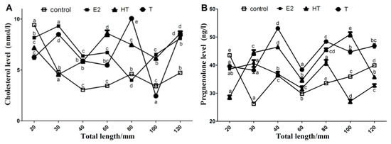 In the control group, the cholesterol level significantly dropped during ovary differentiation period (30, 40 and 60 mm TL) (p < 0.05), and remained stable in the differentiated gonads (≥80 mm TL) (Figure 8). Pregnenolone level was higher at 20 mm TL, dropped at 30 mm TL (p < 0.05), and increased at 40, 60, 80, 100 and 120 mm TL (p < 0.05). In the E2 group, the cholesterol level increased at 30 mm TL, dropped at 40, 60, 80mm TL, then increased at 100 and 120 mm TL. The pregnenolone level increased at 30 mm TL, dropped at 40 and 60 mm TL, and then increased. In the T and HT groups, the cholesterol and pregnenolone levels all increased during the testis differentiation period (60 and 80 mm TL).