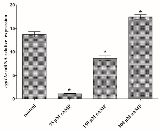 The expression levels of cyp11a were significantly down-regulated in the testis cells treated with 75 and 150 μM cAMP, and up-regulated in the testis cells treated with 300 μM cAMP (p < 0.05) (Figure 9).