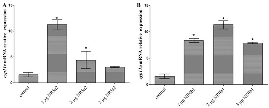 Doses of 1 and 2 μg NR5a2 significantly up-regulated the expression level of cyp11a (p < 0.05), while 3 μg NR5a2 did not (Figure 10A). All 1, 2 and 3 μg NR0b1 could significantly up-regulate the expression level of cyp11a in the testis cells (p < 0.05) (Figure 10B).