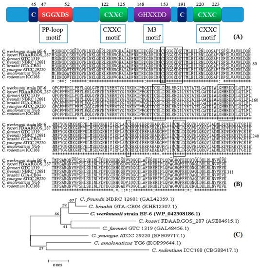 Analysis of the ttcA gene in C. werkmanii BF-6 and encoded protein sequence. Schematic representation of the TtcA protein with its conserved motifs (A). Sequence alignment of reported TtcA proteins representatives in the genus Citrobacter (B). The alignments were conducted with BioEdit software and the conserved amino acid residues and motifs are framed. Phylogenetic tree of TtcA protein of C. werkmanii BF-6 with the species of the same genus (C). This tree was constructed using bootstrapping and Neighbor-Joining methods with MEGA 4.0.
