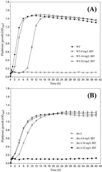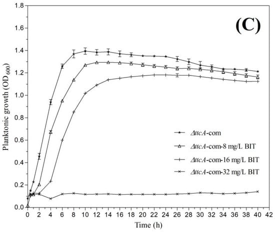 A column of microtiter plate (Corning Inc., Corning, NY, USA) was inoculated with 100 μL of either BF-6, ΔttcA or ΔttcA-com suspensions (OD600 = 0.10). Dilutions of BIT stock solution in a total volume of 100 μL were added such that the final concentrations of BIT were as follows: 0, 4, 8, 16, 32 and 64 mg/L. Eight replicates were set for each drug concentration and the plates were transferred into a static incubator where they were cultured at 30 °C for 4 days. Following this, they were subsequently managed according to the previously described methods, with minor modifications [,]. The growth rates of BF-6, ΔttcA and ΔttcA-com planktonic cells in the cultured plates were measured using a Multiskan GO Reader (Thermo Scientific, Waltham, MA, USA) at 600 nm. The cultivation in each well was discarded gently and washed with 250 μL of sterile water for at least three times to completely remove any of the floating cells. After drying the plate for 30 min at room temperature, each well was filled with 250 μL of 0.1% crystal violet solution (Shanghai Chemical Reagents Co. Ltd., Shanghai, China) to stain the sessile cells attached on the walls of the well for about 40 min. Subsequently, excess of the staining dye was washed away using sterile water for at least three times. After drying the plate at room temperature again, the wells were filled with 250 μL of 95% ethanol (Shanghai Chemical Reagents Co. Ltd., Shanghai, China) to resolubilize the dye for at least 30 min. The OD595 of each well was determined using the same Reader. Meanwhile, the cultures without any BIT were considered as controls.