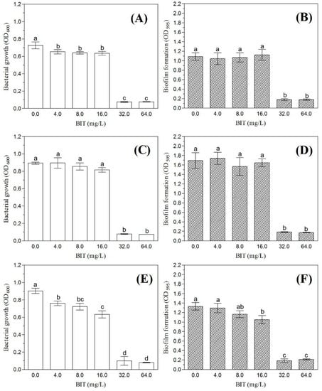 2.4. Effect of BIT on Planktonic Growth and Initial Biofilm Formation