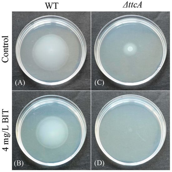 Swimming motility of C. werkmanii BF-6 (A,B) and ΔttcA (C,D) on semisolid agar plates supplemented with 0 or 4 mg/L BIT. Aliquots of 5 μL suspensions were inoculated at the center of the plate with a micropipette and then cultured for 24 h at 30 °C.