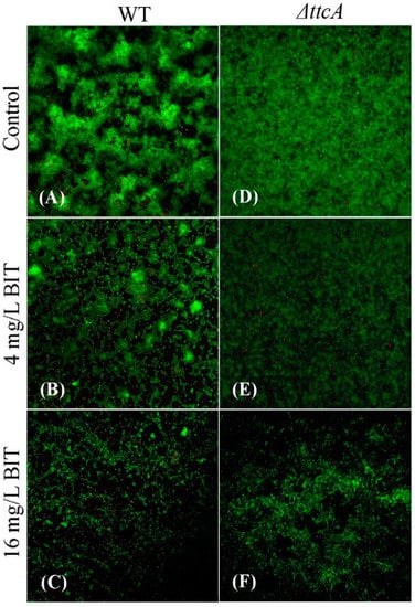 Biofilms of C. werkmanii BF-6 and ΔttcA were first allowed to form on pre-sterilized glass microscope slides and then observed with CLSM according to the method reported previously []. Briefly, aliquots of 2 mL of BF-6 or ΔttcA suspensions (OD600 = 0.05) supplemented with BIT to final concentrations of 0, 4 or 16 mg/L were added to a well of microtiter plate (12 wells, Corning, NJ, USA) containing a cover slip. Following an incubation under static conditions at 30 °C for 4 days, the glass slips were gently taken out and stained with 5 μM SYTO9 dye (Invitrogen, Carlsbad, CA, USA) and 30 μM propidium iodide (Sigma, St. Louis, MO, USA) in dark for at least 15 min at room temperature. Finally, the stained biofilms were visualized using CLSM (LSM 710 Zeiss, Jena, Germany). In addition, a quantitative analysis of biofilm parameters of the acquired images was analyzed using a COMSAT 2.1 software [,].