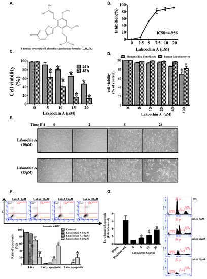 Cell proliferation was assayed by using the Sulforhodamine B (SRB) assay. Results showed that treatment with lakoochin A (2.5–20 μM, dissolved in dimethyl sulfoxide (DMSO) on A375.S2 melanoma cells for 24 h could inhibit cell proliferation in a concentration-dependent manner and with a half maximal inhibitory concentration (IC50) value of 4.956 μM (Figure 1B). The MTT assay suggested that lakoochin A treatment for 24 or 48 h reduced the cell viability in a concentration-dependent manner (0–20 μM, Figure 1C). Additionally, as shown in Figure 1D, lakoochin A did not significantly change the cell viability of human skin fibroblasts and keratinocytes, until high doses (100 μM) were administered.