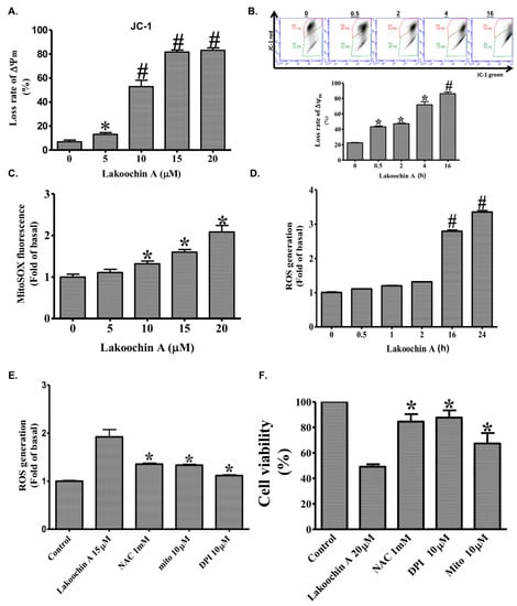 (A) The dose effect of lakoochin A at 24 h on the mitochondrial membrane potential (∆Ψm) of A375.S2 cells, as determined by flow cytometry staining with JC-1. (B) The time effects of lakoochin A on the ∆Ψm of A375.S2 cells pre-labeled with 5,5′,6,6′-Tetrachloro-1,1′,3,3′-tetraethylbenzimidazolylcarbocyanineiodide (JC-1) (10 μg/mL) for the indicated times (0.5–16 h). (C) Effect of lakoochin A on mitochondrial reactive oxygen species (ROS) production (determined by flow cytometry after staining with MitoSOX Red indicator) in A375.S2 cells. (D) Effect of lakoochin A on cellular ROS production (determined by flow cytometry after staining with H2DCFDA reagent). (E) The cellular ROS production of several antioxidants and lakoochin A, determined by flow cytometry staining with H2DCFDA reagent. The A375.S2 cells were pretreated for 1 h with mitochondria-targeted antioxidant (MitoTEMPOL), antioxidant (NAC), or nicotinamide adenine dinucleotide phosphate (NADPH) oxidase inhibitor (DPI) and then treated with lakoochin A for 4 h. (F) Effect of MitoTEMPOL, NAC, and DPI on lakoochin A-induced A375.S2 cell apoptosis (determined by MTT assay). The data were collected from at least three individual experiments and expressed as mean ± S.E.M. * p < 0.05, # p < 0.01 compared to the control group.