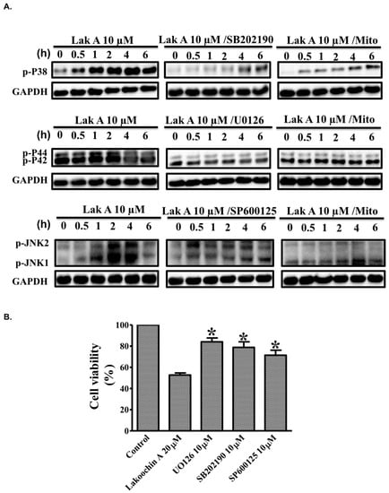 To characterize the effects of lakoochin A on MAPK pathways, Western blotting was conducted in A375.S2 (Figure 3A). As shown, lakoochin A (10 µM) induced phosphorylation of p38, extracellular signal–regulated kinases (ERK, p44/p42), and c-Jun N-terminal kinases (JNK), in a time-dependent manner, in A375.S2 cells (from 0 to 6 h). On the other hand, these phosphorylation effects could be suppressed by pre-treating specific inhibitors (SB-202190, U-0126, and SP600125, respectively) and MitoTEMPOL (mitochondria-targeted antioxidant, 10 µM) for 1 h. Furthermore, lakoochin A (20 µM) caused decreases in the viability of A375.S2 cells which could be reversed by MAPKs inhibitors, namely SB-202190, U-0126, and SP600125. The results indicate that lakoochin A-induced MAPK pathways activation can be generated by mitochondrial ROSs in A375.S2 melanoma cells.