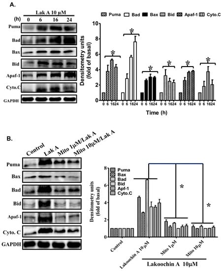 According to the Western blotting results, lakoochin A (10 µM) can increase the apoptosis-related protein expression, such as Puma, Bax, Bad, Bid, Apaf-1, and cytochrome c, in a time-dependent manner (from 0 to 24 h) (Figure 4A). Furthermore, the mitochondria-targeted antioxidant (MitoTEMPOL with 1 or 10 µM) was pre-treated to confirm the role of mitochondrial ROSs. As shown in Figure 4B, 10 µM lakoochin A-induced expression of Puma, Bax, Bad, Bid, Apaf-1, and cytochrome c can be suppressed by treatment with MitoTEMPOL in A375.S2. These results suggest that lakoochin A promotes apoptosis-related protein expression in A375.S2 cells dependent on mitochondrial ROS production.