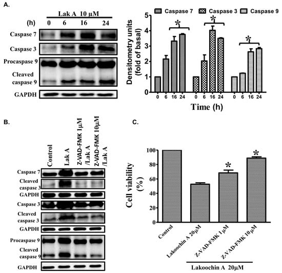 (A) Effects of lakoochin A (10 μM) on the expression status of caspase-7, caspase-3, and caspase-9 in A375.S2 cells in a serial time-period (0–24 h). (B) Effects of caspase inhibitor carbobenzoxy-valyl-alanyl-aspartyl-[O-methyl]-fluoromethylketone (Z-VAD-FMK) on lakoochin A-induced increases in caspase-3, -7, and -9. Cells were pre-treated for 1 h with Z-VAD-FMK (1 or 10 μM) followed by treatment with lakoochin A for 16 h. The levels of caspase-3, -7, and -9 were evaluated by immunoblotting. (C) Effect of Z-VAD-FMK (1 or 10 μM) on lakoochin A-induced A375.S2 cell apoptosis (determined by MTT assay). The data were collected from at least three individual experiments and expressed as mean ± S.E.M. * p < 0.05, as compared to the control group.
