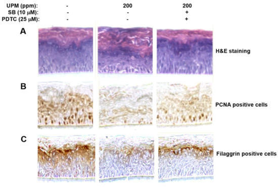 2.7. UPM Affected Morphology of the Reconstructed Epidermis and Reduced Expression of Proliferating Cell Nuclear Antigen (PCNA) Gene and Filaggrin Gene