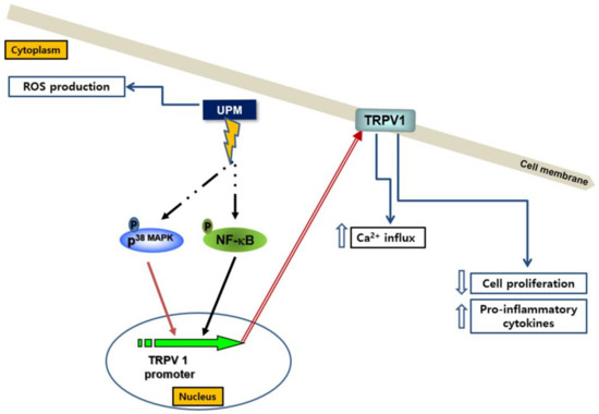Kwon, K.; Park, S.-H.; Han, B.S.; Oh, S.W.; Lee, S.E.; Yoo, J.A.; Park, S.J.; Kim, J.; Kim, J.W.; Cho, J.Y.; et al. Negative Cellular Effects of Urban Particulate Matter on Human Keratinocytes Are Mediated by P38 MAPK and NF-κB-dependent Expression of TRPV 1. Int. J. Mol. Sci. 2018, 19, 2660. https://doi.org/10.3390/ijms19092660