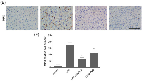 AWRK6 relieved lipopolysaccharide (LPS)-induced liver injury in mice. The mice were administrated with LPS (50 mg/kg) by intraperitoneal injection. AWRK6 (10 mg/kg) or PMB (10 mg/kg) was administered intraperitoneally 1 h after LPS and an equal volume of sterile saline was used as a negative control. (A) The protective effect of AWRK6 on enhanced ALT activity in LPS-treated mice liver, assayed by Alanine aminotransferase Assay Kit. (B) The effect of AWRK6 on SOD activity in LPS-treated mice liver assayed by Superoxide Dismutase Assay Kit. (C) The effect of AWRK6 on iNOS activity in LPS-treated mice liver, assayed by Nitric Oxide Synthase Assay Kit. (D) Histologic changes of liver tissues upon LPS and AWRK6 treatment, stained with HE. (E) Micrographs of liver sections stained with MPO antibody. (F) The analysis of liver sections stained with MPO was carried out using ImageJ. * p < 0.05 compared with the LPS groups. Scale bar indicates 100 μm.