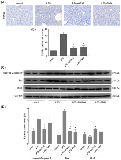 AWRK6 inhibited LPS-induced apoptosis in mice liver. (A) AWRK6 (10 mg/kg) treatment for 24 h reduced DNA fragmentation induced by LPS (50 mg/kg), assayed by TUNEL assay. (B) The results of TUNEL assay were analyzed by ImageJ. (C) The protein levels of cleaved-caspase 9, BAX and Bcl-2 were analyzed by western blotting. (D) The quantification of western blotting results was carried out using ImageJ. * p < 0.05 compared with the LPS groups. Scale bar indicates 100 μm.