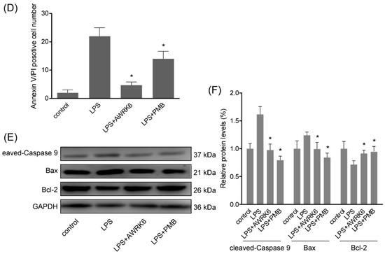 AWRK6 inhibited LPS-induced liver cell apoptosis in HepG2 cells. (A) The viabilities of HepG2 liver cells treated with LPS (40 μg/mL) with/without AWRK6 for 24 h, examined by MTT assay. (B) The cells treated with LPS and AWRK6 (200 μg/mL) were observed under phase contrast microscope. (C) The cell apoptosis was detected by Annexin V-FITC/PI staining followed by fluorescence microscopy. (D) The apoptotic cell number in the results of Annexin V-FITC/PI staining was analyzed by ImageJ. (E) The protein levels of cleaved-caspase 9, BAX and Bcl-2 were analyzed by western blotting. (F) The results of western blotting were quantified using ImageJ. Bar indicates 100 μm. * p < 0.05 compared with the LPS groups.